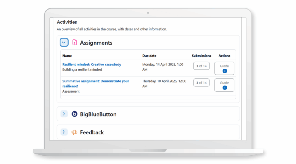 Why it matters: The Activities Overview page is no longer just a tidy list — it’s a genuine command centre for learning. Teachers can instantly see what needs attention or grading without hunting through multiple screens, while learners get a clear visual of their progress: what’s completed and what’s coming next. It’s a simple change that makes a big difference in reducing confusion and keeping everyone on track.
