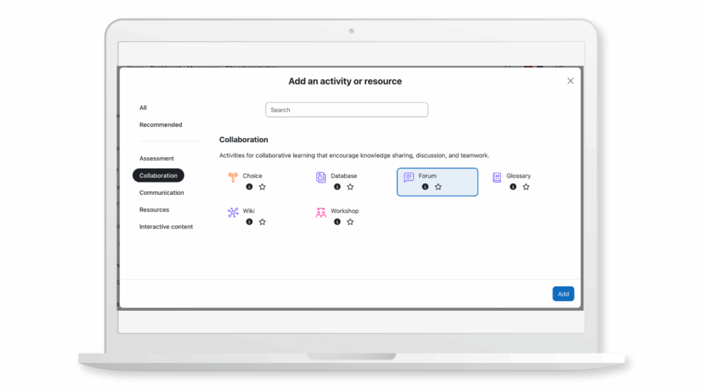 Activities and resources are now grouped by purposeassessment, collaboration, communication, resources, and interactive content — making it easier to find exactly what you need. Plus, the new “Add” button means fewer misclicks and smoother setup when you’re adding activities.